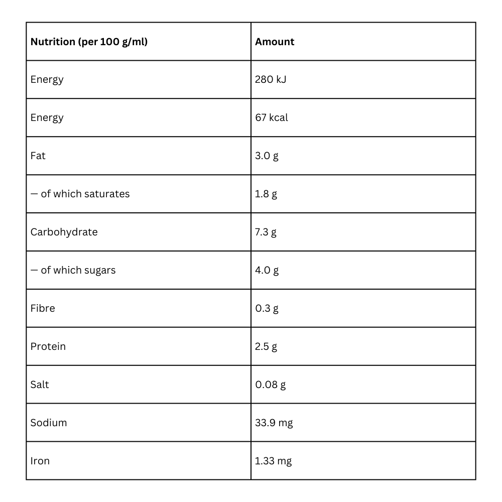 Pasteurised rehydrated fermented milk 68% (MILK) – Water – Cream 8% (MILK) – Strawberry purée 5% – Modified maize starch – Natural flavouring – Concentrated carrot juice* – Thickener: locust bean gum – Acidifier: citric acid – Emulsifier: rapeseed mono- and diglycerides – Ferrous lactate.