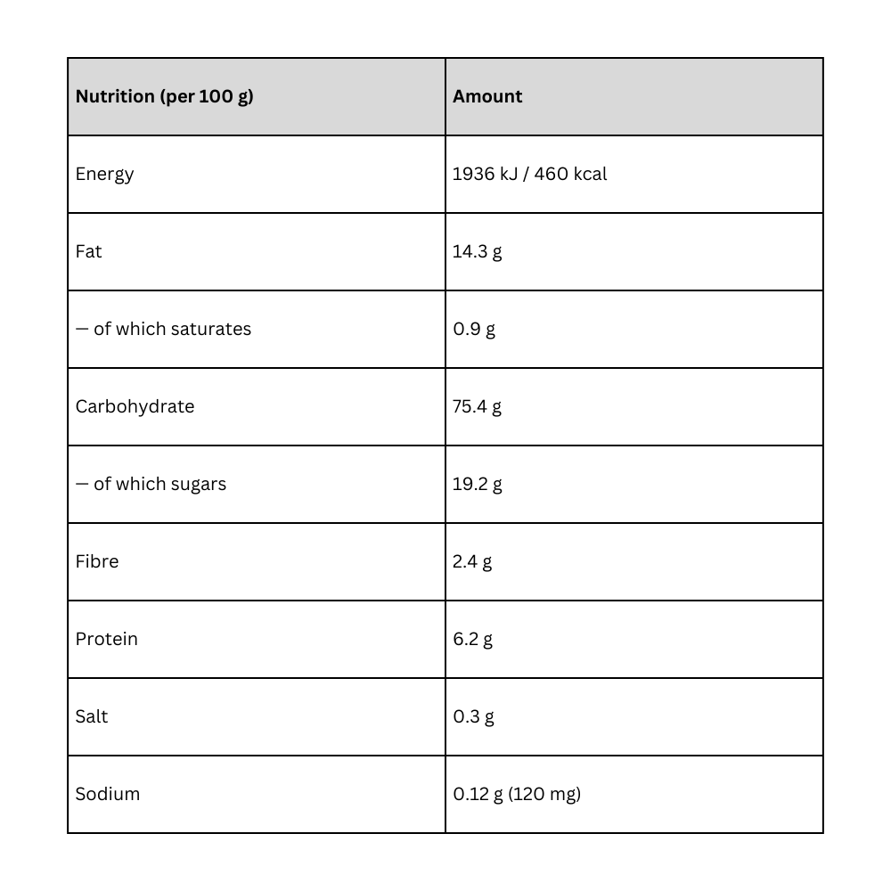 WHEAT flour* 59.2% (GLUTEN), cane sugar* 18.5%, WHEAT starch* (GLUTEN), rapeseed oil* 13.4%, whole EGGs* 2.7% (EGG), leavening powders (sodium carbonates, potassium tartrates), natural vanilla flavour, vitamin B1. *Organic products. May contain traces of: MILK, SOY, NUTS and SESAME.Specification:
