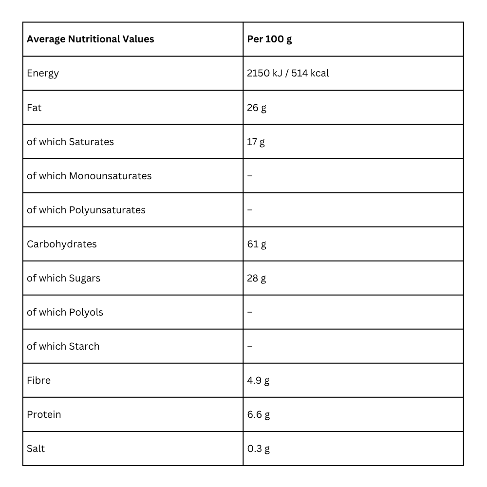 Soft WHEAT flour, sugar, chocolate 14% (cocoa mass, sugar, cocoa butter, BUTTER, emulsifier: SOYA lecithin), grated coconut 12%, WHEAT starch, EGGS, BUTTER, chocolate flakes 2.9% (sugar, cocoa mass, cocoa butter, whole MILK powder, BUTTER, natural vanilla flavouring), rapeseed oil, natural coconut flavouring, raising agents (sodium carbonates, citric acid), salt, skimmed MILK powder.