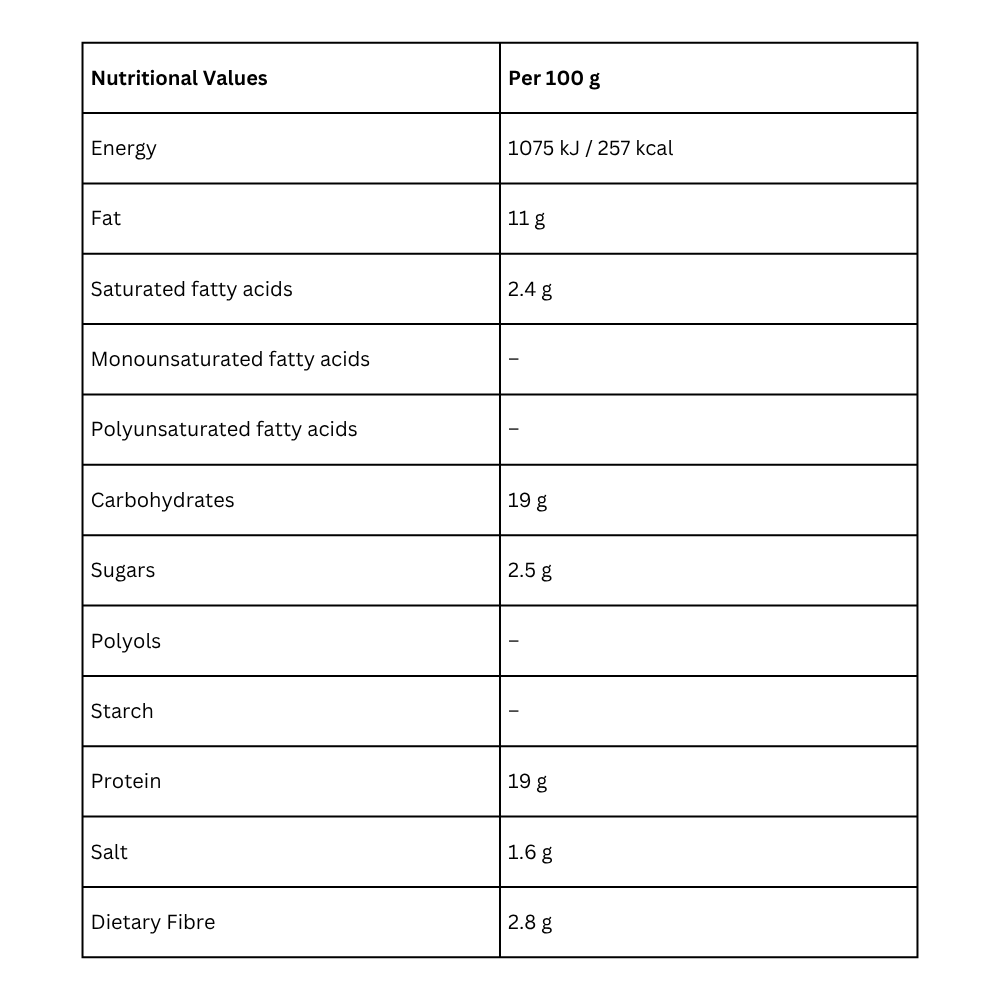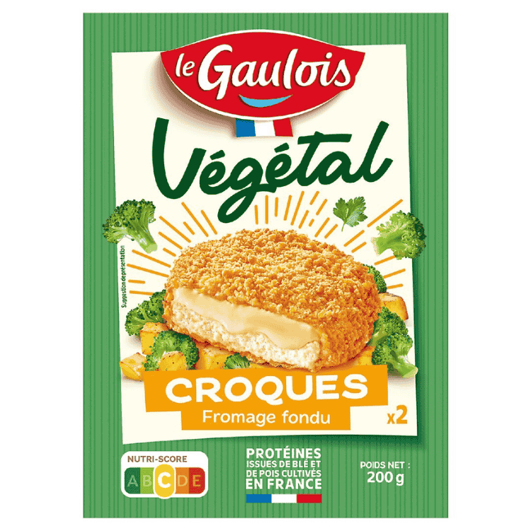 Reduced-fat melted cheese: 29.5% (cheeses: 15%, water, skimmed milk powder, milk proteins, melting salts: sodium citrates, butter), breadcrumb coating: 24% (wheat flour, water, salt, yeast, spices), water, textured proteins from a blend of wheat and peas: 15.7% (water, wheat gluten: 3.8%, pea protein: 2.1%, pea fibre, rapeseed oil, natural flavouring), sunflower oil, wheat gluten: 3.3%, dehydrated potato flakes, egg white powder, wheat fibre, natural pepper flavouring, natural flavourings, salt. Fried in sunflower oil.Specification: