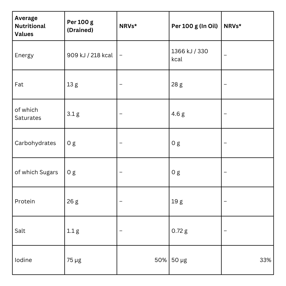 Thon, huile d’olive, sel iodé protégé Presal (sel marin italien, iodate de potassium 0,007 %).