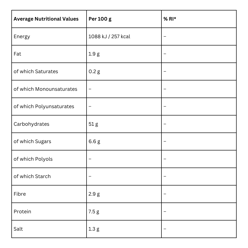 Farine de BLÉ* 69 % , eau, levure, sel, GLUTEN DE BLÉ, huile de colza, épaississant : gomme de guar, sucre, conservateur : propionate de calcium. *Ingrédient issu du commerce équitable français