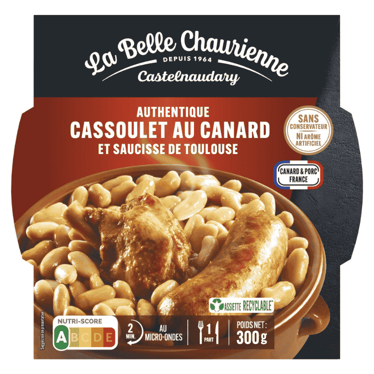 Description: Notre cassoulet est cuisiné simplement, sans conservateur, ni arômeIngredients: Sauce cuisinée : eau, concentré de tomate, sel, graisse de canard, ail, poivre - haricots lingots 28% - Manchon de canard précuit 23% : manchon de canard origine France, sel - saucisse de Toulouse grillée 15% : viande et gras de porc origine France, eau, boyau naturel de porc, sel, poivre. (% exprimés à l'emboîtage)