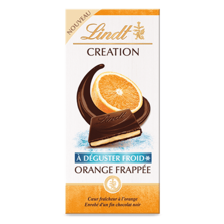 Description: Pour quelle recette Lindt CREATION allez-vous craquer aujourd'hui ? Succombez à Lindt CREATION Orange Frappée : La fraîcheur acidulée d'un délicieux fourrage à l'orange, au coeur du fin chocolat noir Lindt, pour une sensation de fraîcheur irrésistible ! Pour CREATION Orange Frappée, les Maîtres Chocolatiers Lindt ont développé un fourrage à la recette et à la texture uniques. Pour une sensation de fraîcheur encore plus intense et une texture toujours aussi fondante, conservez votre tablette au frais et dégustez-la juste sortie du réfrigérateur.