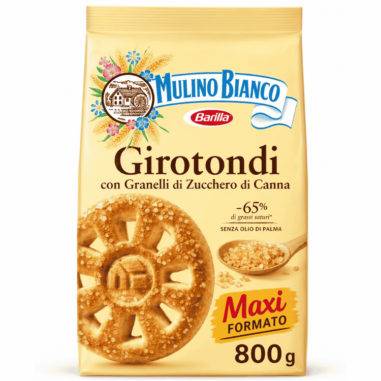Les Girotondi Mulino Bianco sont des biscuits sablés avec des grains de cassonade. Leur structure légère et croustillante et leur goût délicat, sucré en surface par le sucre de canne ambré en gros cristaux, vous donnent une expérience de goût simple et délicat.