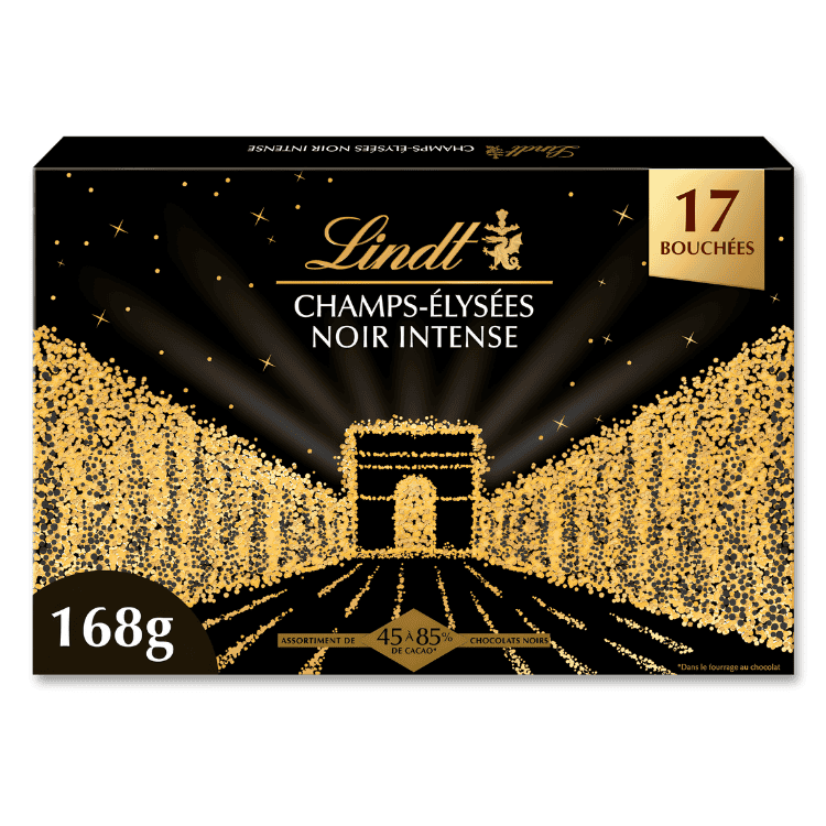 Assortment of 17 extra-fine filled dark chocolate bites. Discover an assortment of 17 chocolates with the Lindt CHAMPS-ÉLYSÉES Dark Intense 168g Box. Lindt Master Chocolatiers have put all their expertise into creating four dark chocolate recipes, with cocoa content ranging from 45% to 85%, presented in a chic and festive box, perfect for gifting or sharing. Enjoy a variety of four exquisite creations for an unforgettable tasting experience: Pyramide Dark 45%, Arc de Triomphe Dark 60%, Cabosse Dark Caramel 65%, and Heart Dark Intense 85%. Add a touch of magic to your festive season with the most enchanting of Lindt’s CHAMPS-ÉLYSÉES collections.