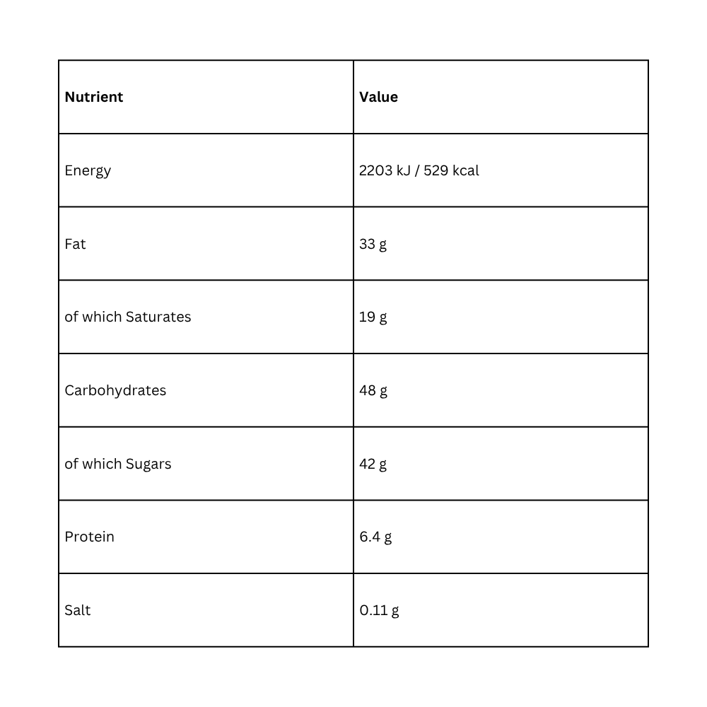 Sugar, cocoa mass, concentrated milk fat, cocoa butter, low-fat cocoa, invert sugar, almonds (2.5%), glucose syrup, stabiliser (sorbitol), cocoa nibs (1.4%), milk powder, vegetable fat (coconut), wafer pieces (0.6%) (wheat and rice flours, sugar, raising agent (sodium carbonates), dextrose, salt, natural flavouring), brown sugar, emulsifier (soy lecithin), hazelnuts (0.2%), lactose, skimmed milk powder, salt, preservative (sorbic acid), barley malt extract, vanilla, natural flavouring, flavouring.