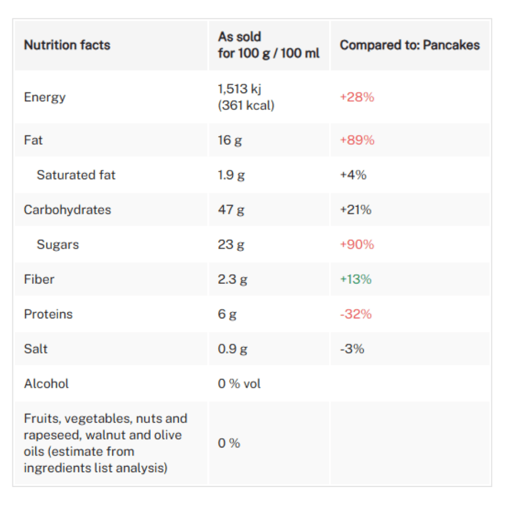 Wheat flour (31,8%), fresh eggs (17,1%), sunflower oil, dextrose, sugar, fresh pasteurized whole milk (8%), water, humectant: glycerol, emulsifiers: mono and diglycerides of fatty acids, flavourings, raising agents (disodium diphosphate, sodium hydrogen carbinate), salt. May contain traces of soya.