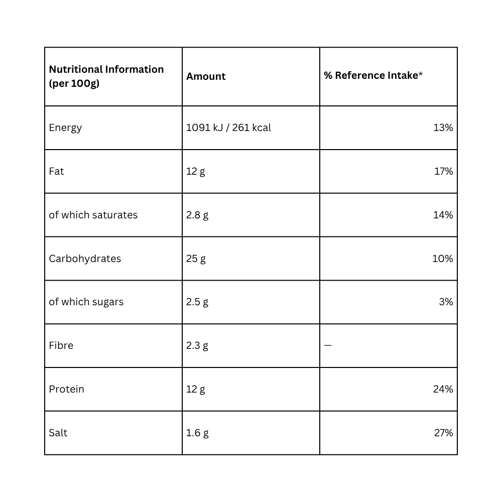 Sliced sandwich bread (wheat flour, whole wheat flour, fava bean flour, malted barley flour, water, rapeseed oil, baker’s yeast, sugar, salt, wheat gluten, spirit vinegar), pork ham, Emmental cheese, water, rapeseed oil, egg yolk, spirit vinegar, dextrose, glucose syrup, starch and/or modified starch, culture, preservative: sodium nitrite, stabiliser: triphosphates, antioxidant: sodium erythorbate, salt, natural flavourings, pork broth, pepper, mustard seeds.