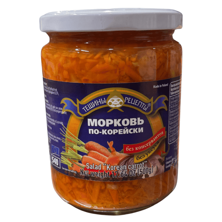Teshchiny Recepty Korean Carrots are a vibrant and flavourful salad from Ukraine, inspired by traditional Korean-style recipes. Made with finely shredded carrots, aromatic spices, garlic, and a touch of vinegar, this dish offers a perfect balance of tangy, spicy and savoury notes. Refreshing yet zesty, it is ideal as a side dish, appetiser, or accompaniment to meat, fish, or grilled vegetables. Conveniently prepared and ready to serve, it brings a burst of flavour and colour to the table, reflecting both Ukrainian culinary creativity and the influence of international tastes.